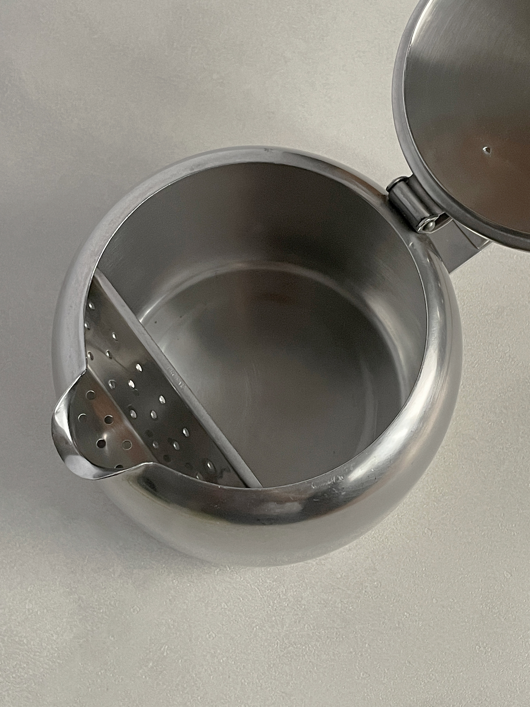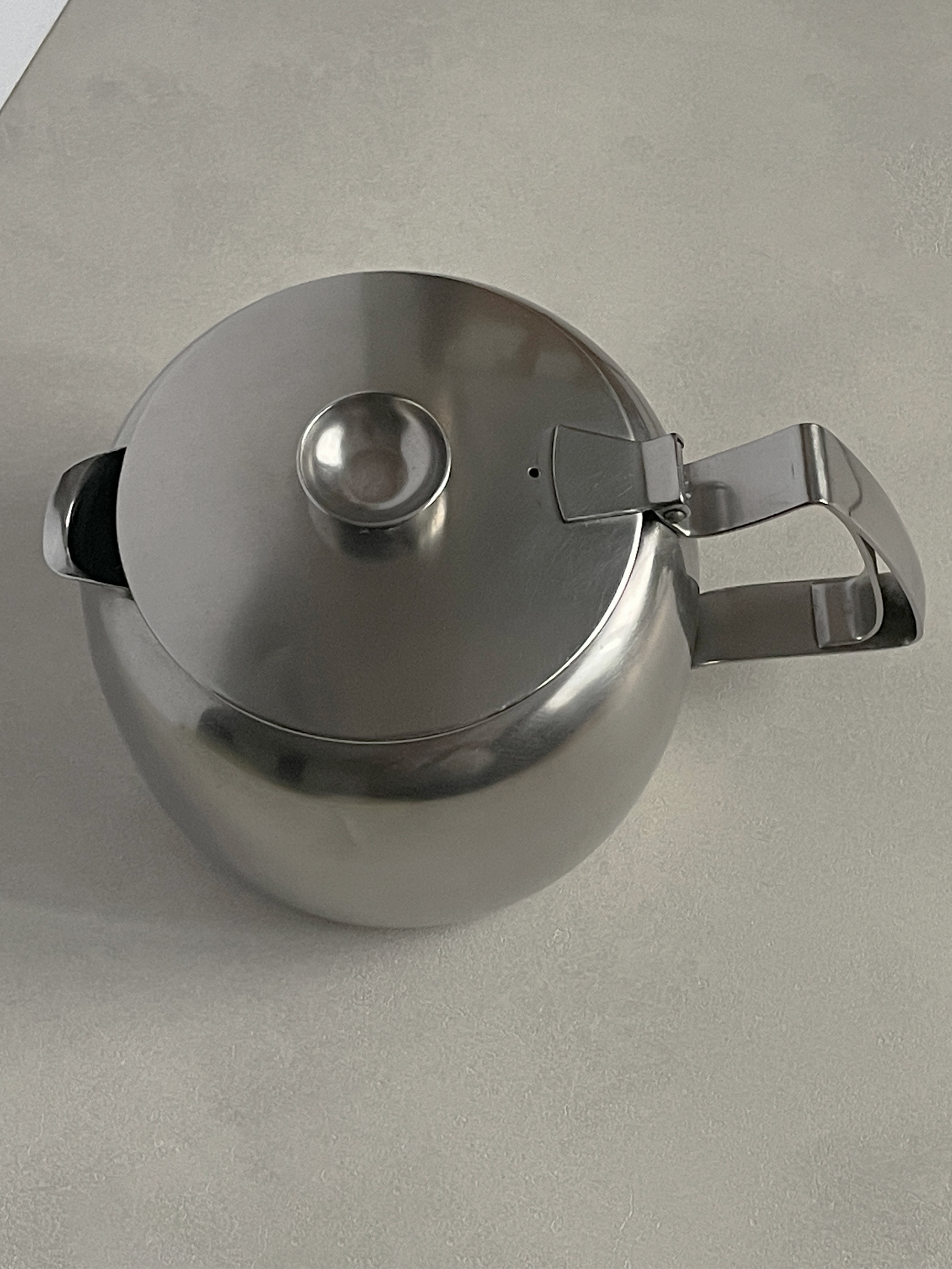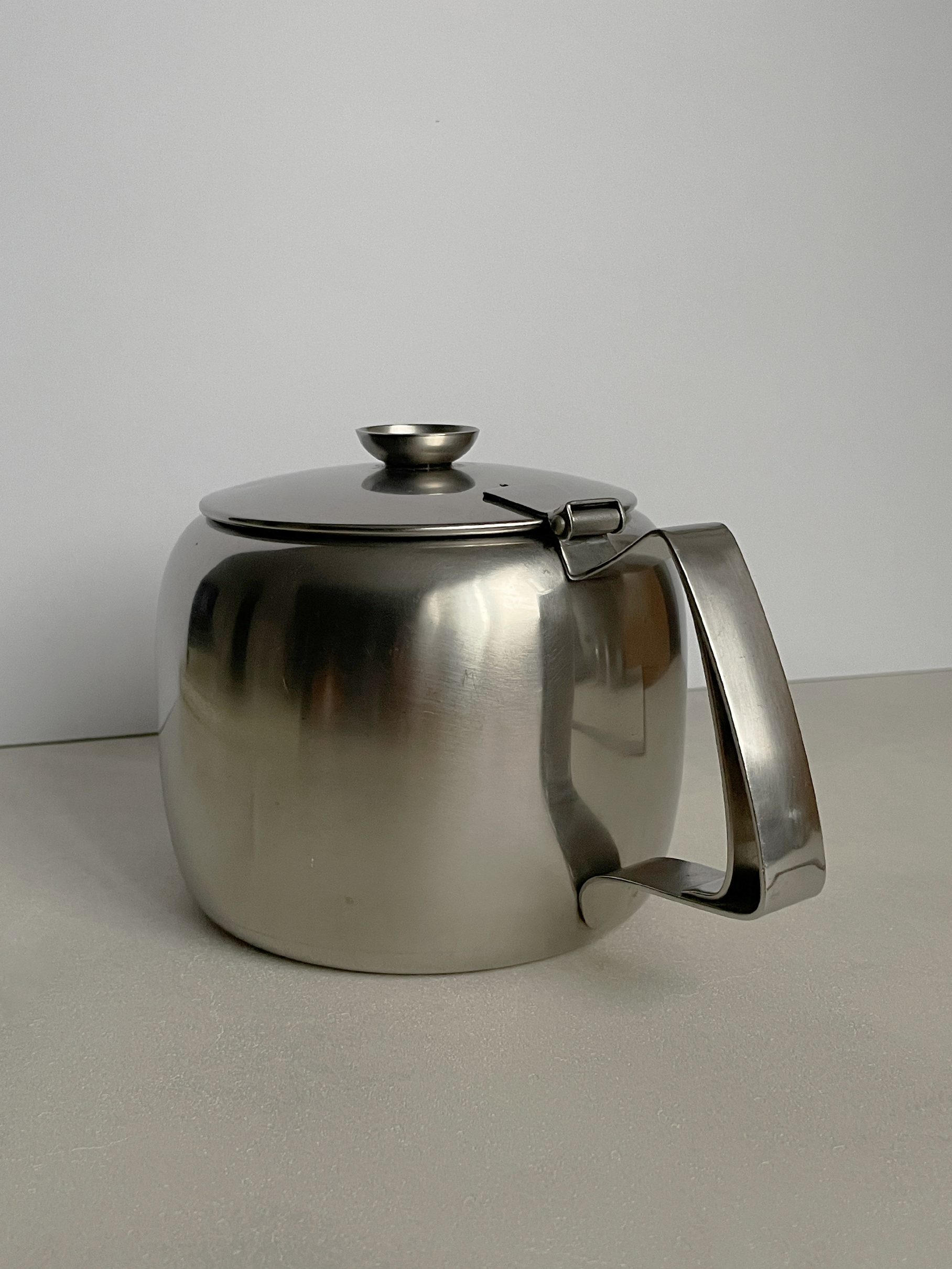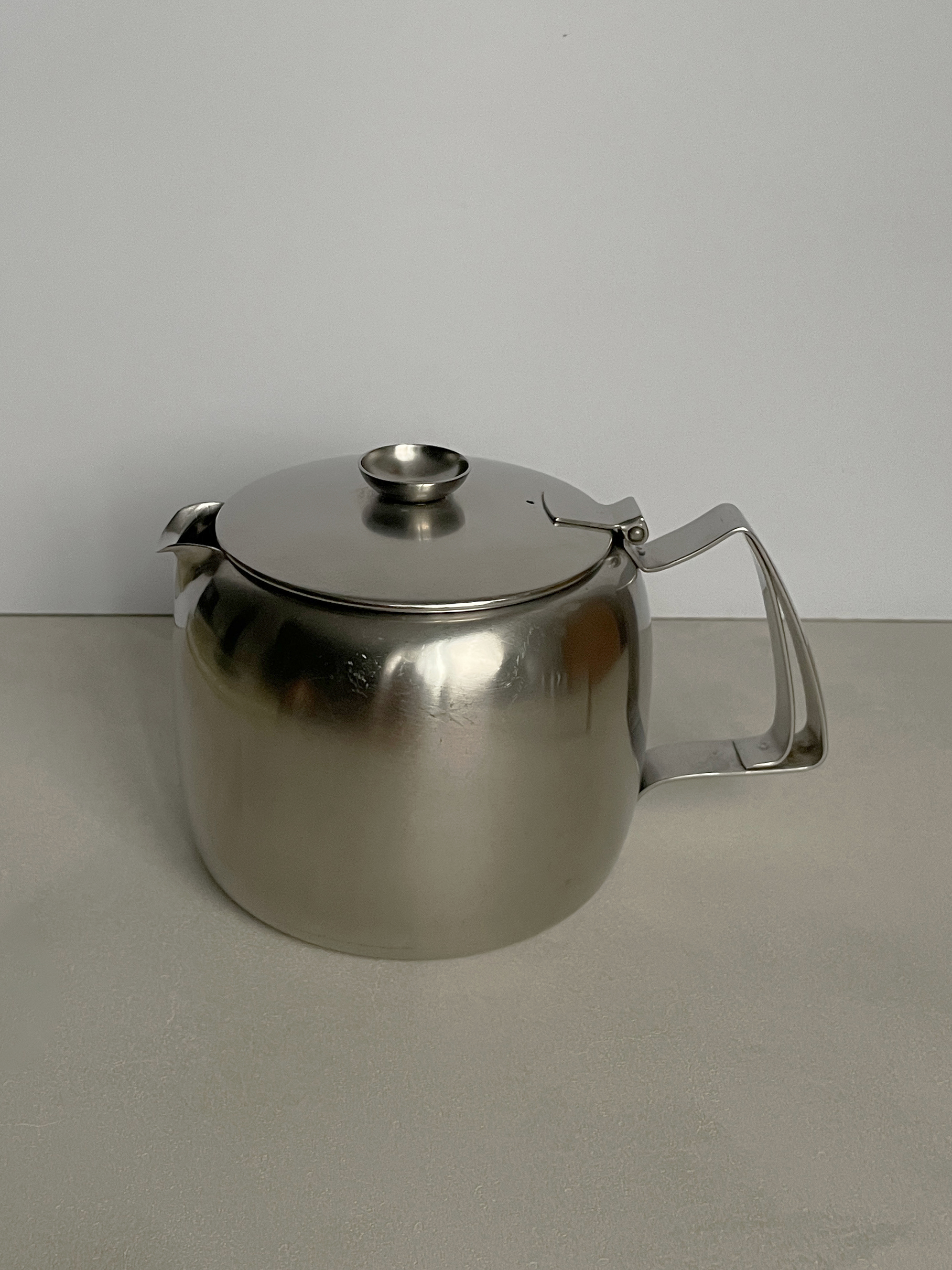 영국 Old Hall 사에서 1960년대 생산된 빈티지 티팟입니다. 은은하게 빛나는 무광의 스테인레스 스틸 재질로 실용성이 있고, 만듦새가 견고한 아름답습니다. 오랜시간 지나온 것에 비해 좋은 컨디션을 유지하고 있습니다.