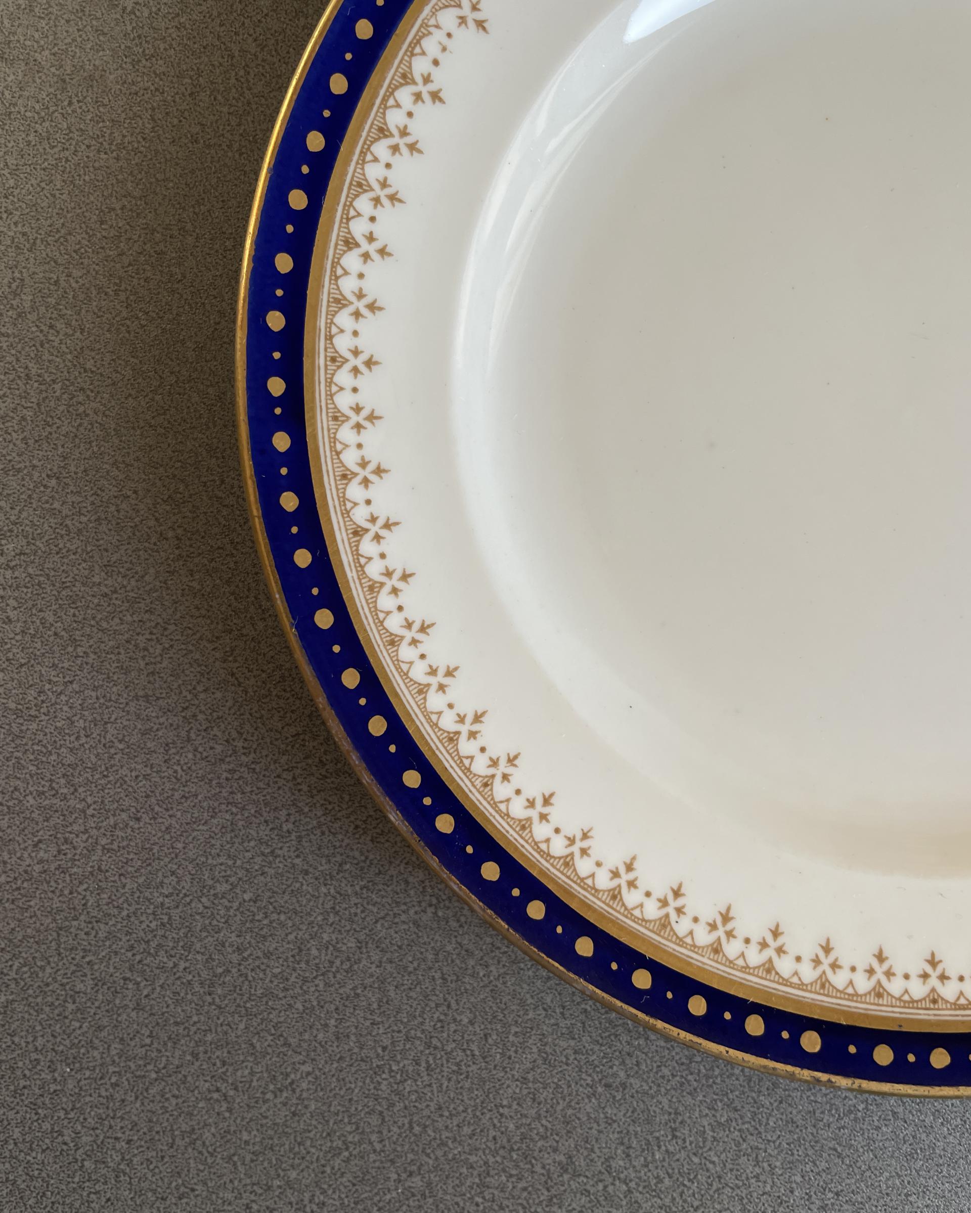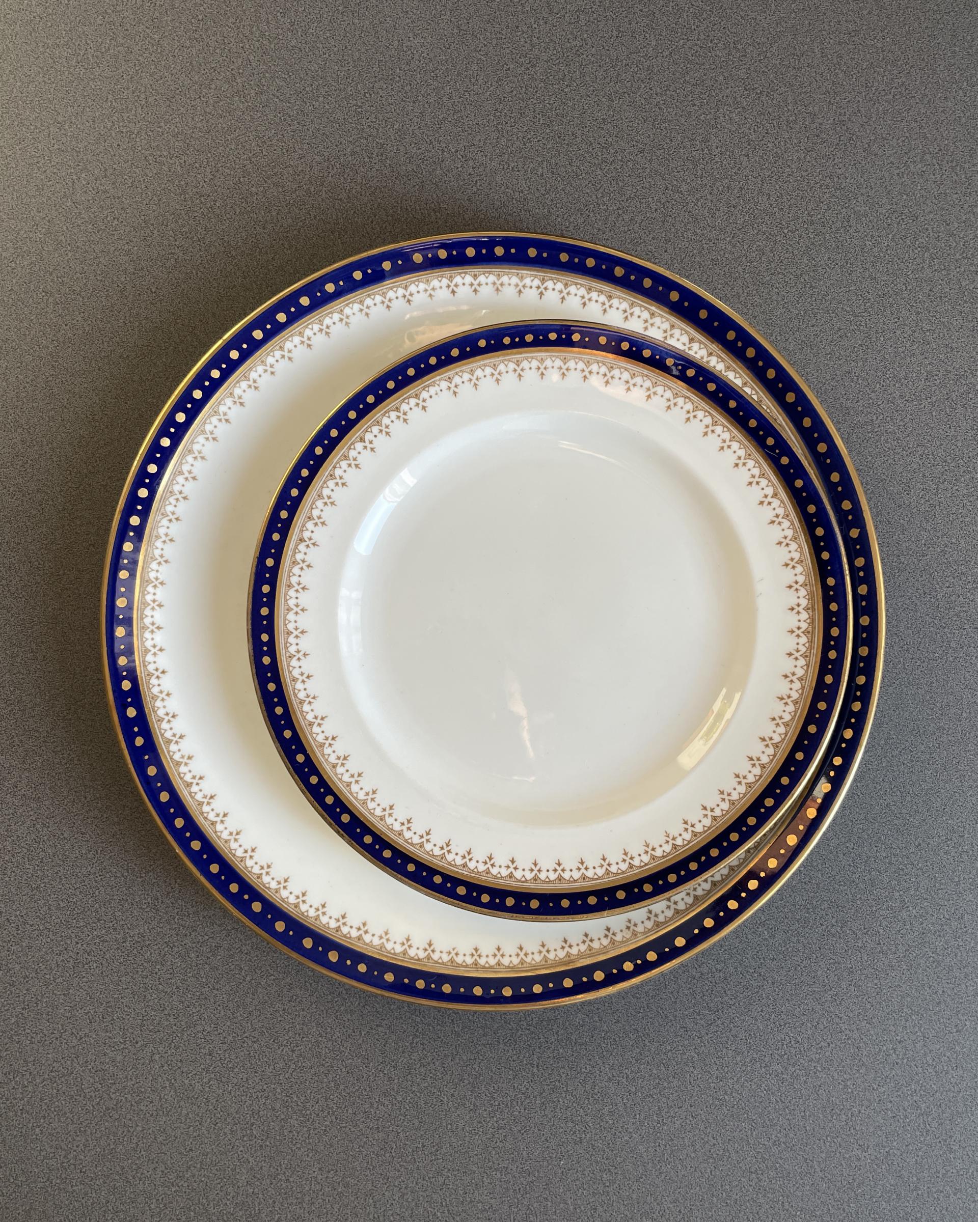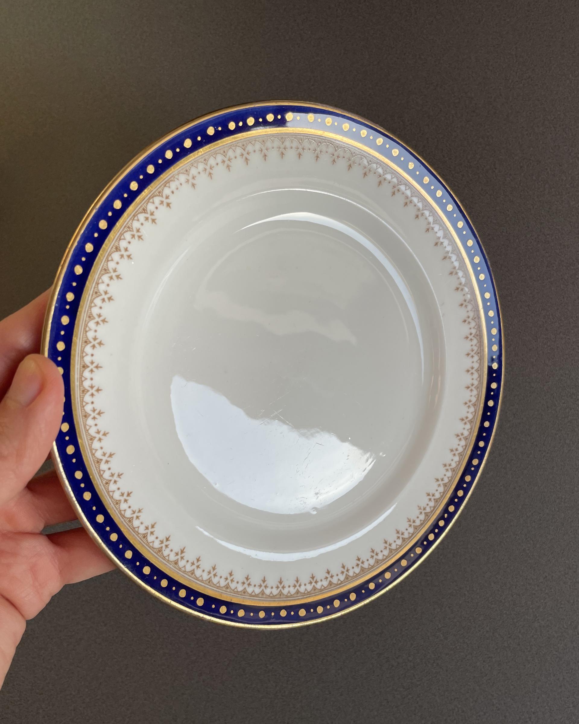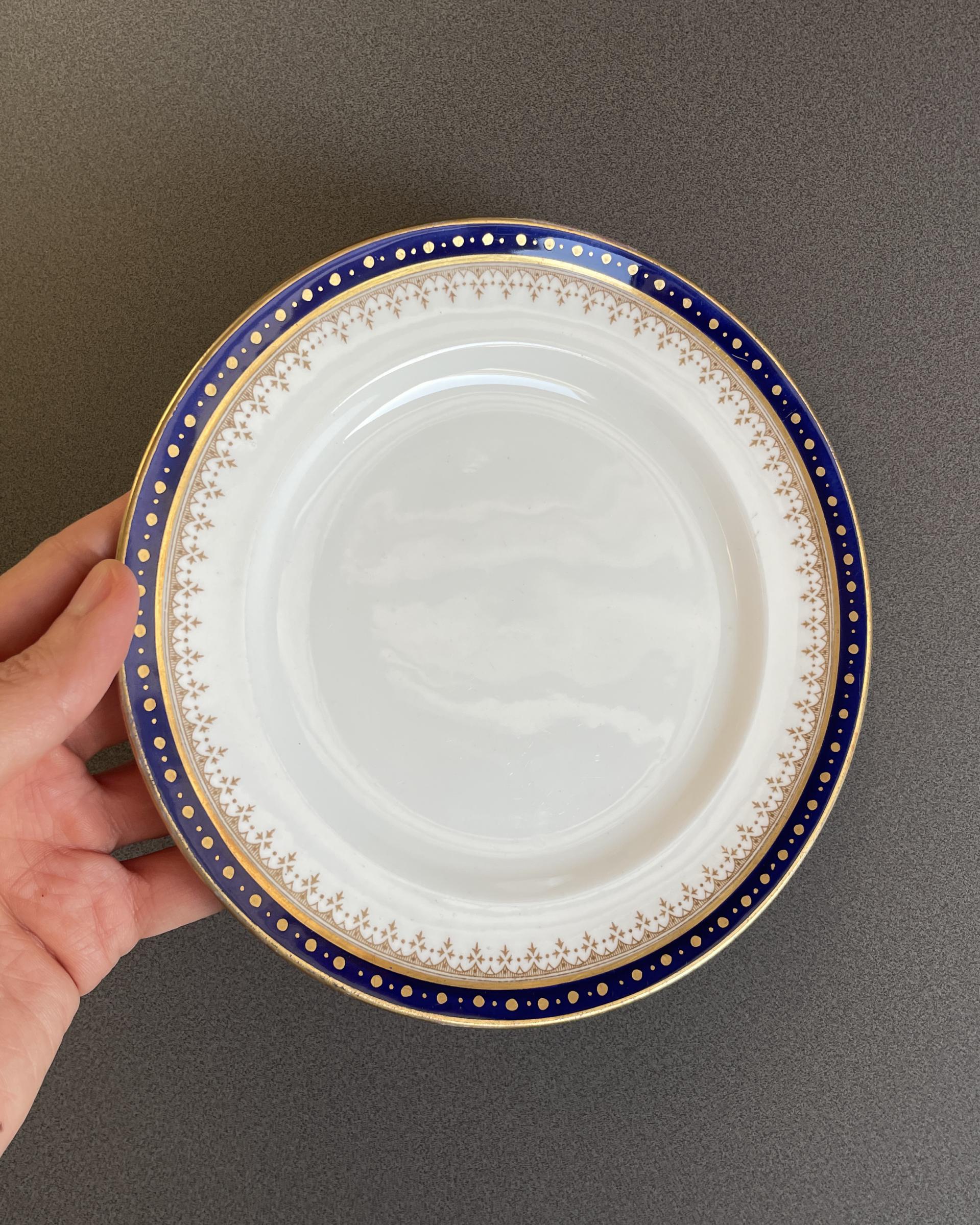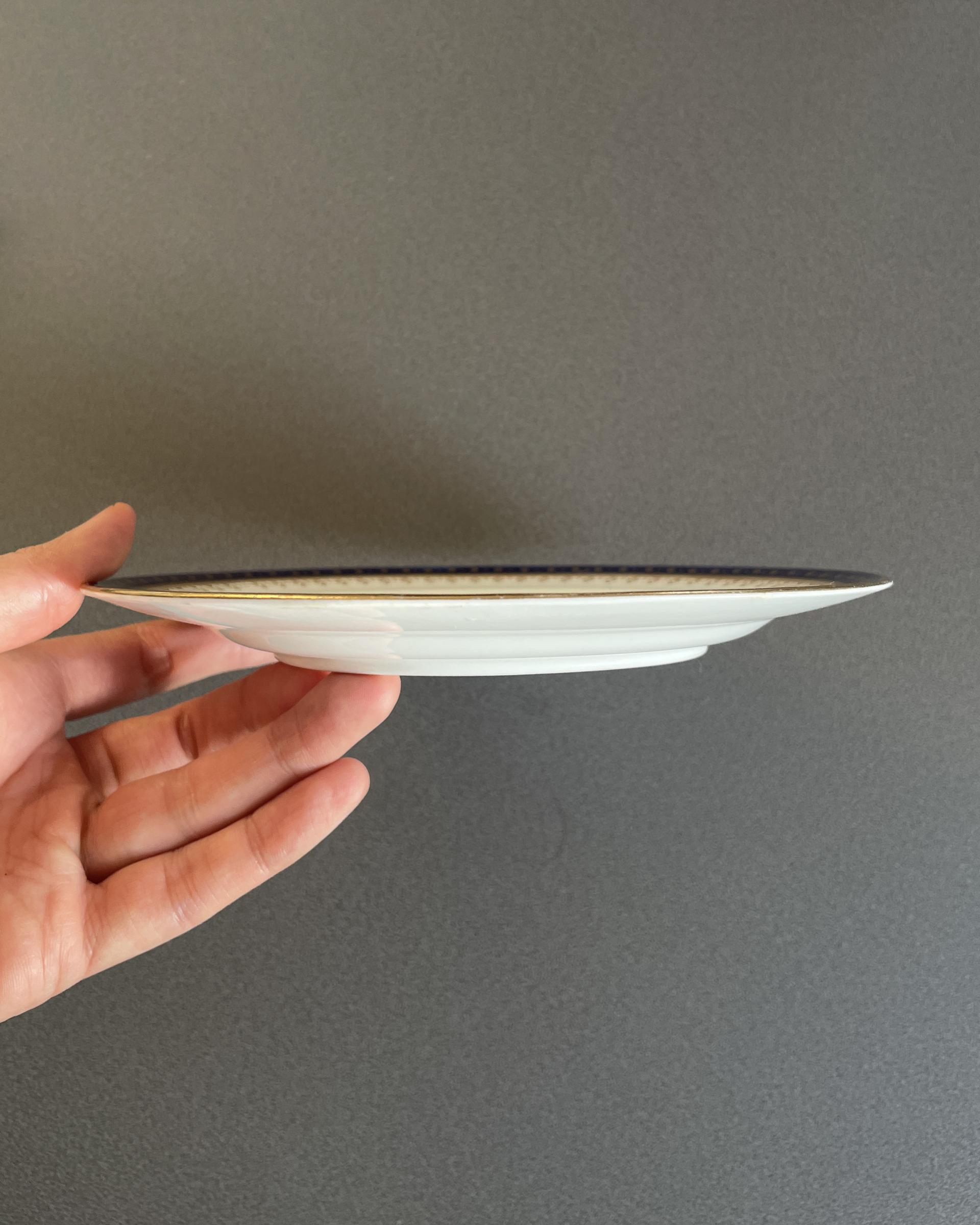 영국 Crown Staffordshire 사의 빈티지 디저트 플레이트입니다. 깊은 코발트 블루 색과 금장의 아름다운 패턴이 매력적입니다.