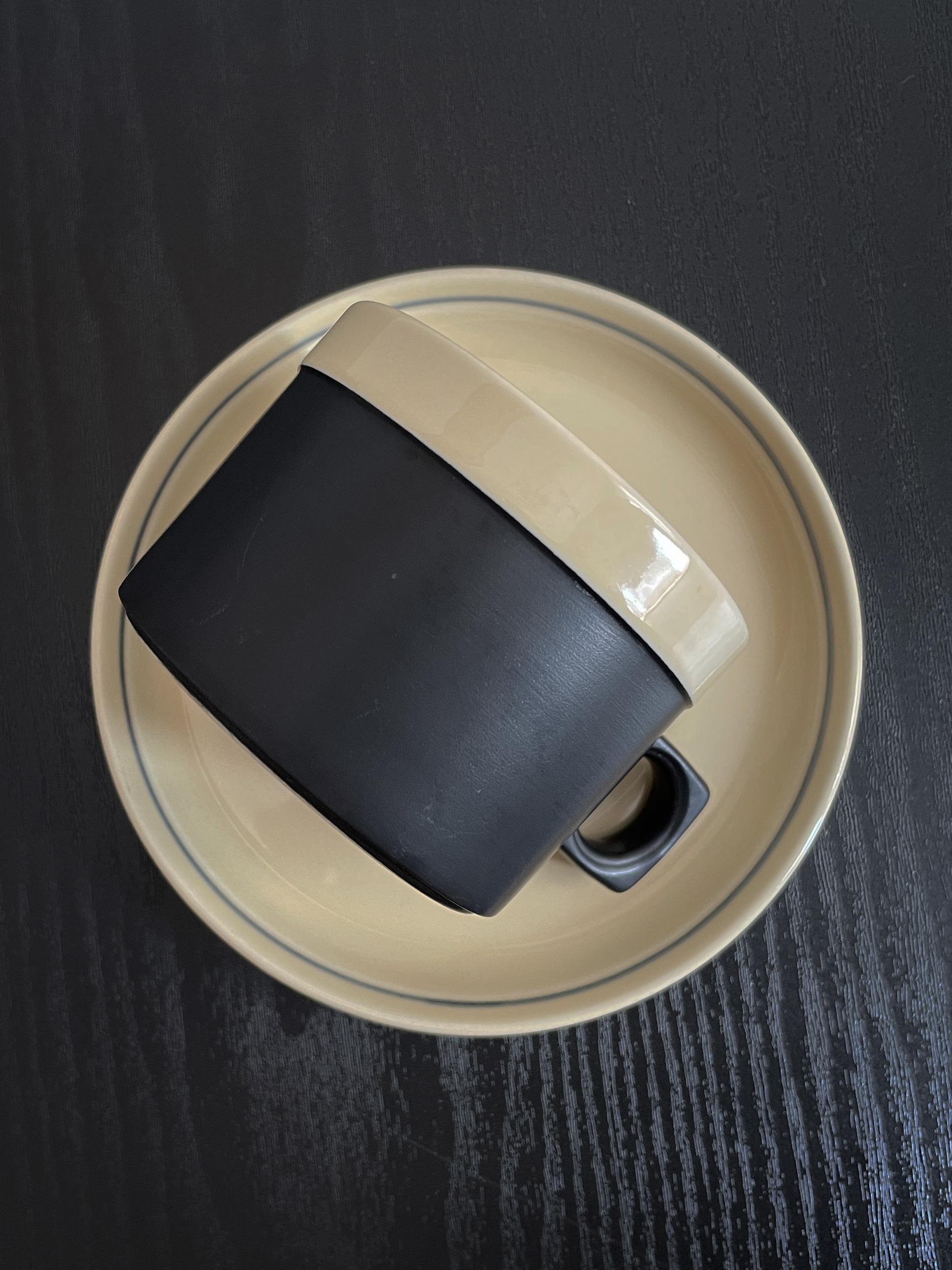 영국 Hornsea 사의 Ebony 시리즈 빈티지 컵&소서 입니다. 매트한 검정색과 부드러운 바닐라색의 두가지 톤의 조화가 매력적입니다. 직선과 원형으로 이루어진 전체적인 디자인은 빈티지하면서 모던한 느낌을 동시에 줍니다.