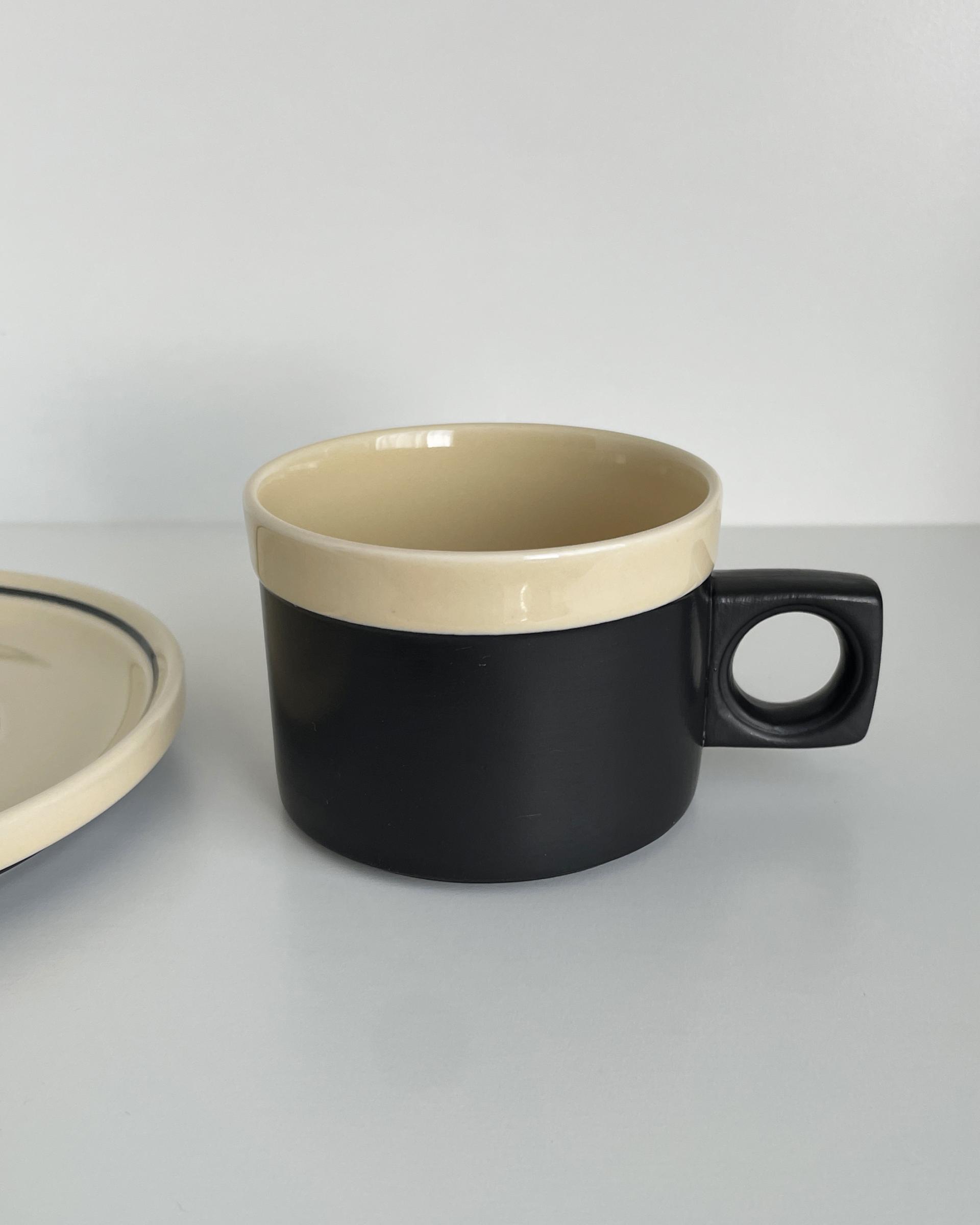 영국 Hornsea 사의 Ebony 시리즈 빈티지 컵&소서 입니다. 매트한 검정색과 부드러운 바닐라색의 두가지 톤의 조화가 매력적입니다. 직선과 원형으로 이루어진 전체적인 디자인은 빈티지하면서 모던한 느낌을 동시에 줍니다.