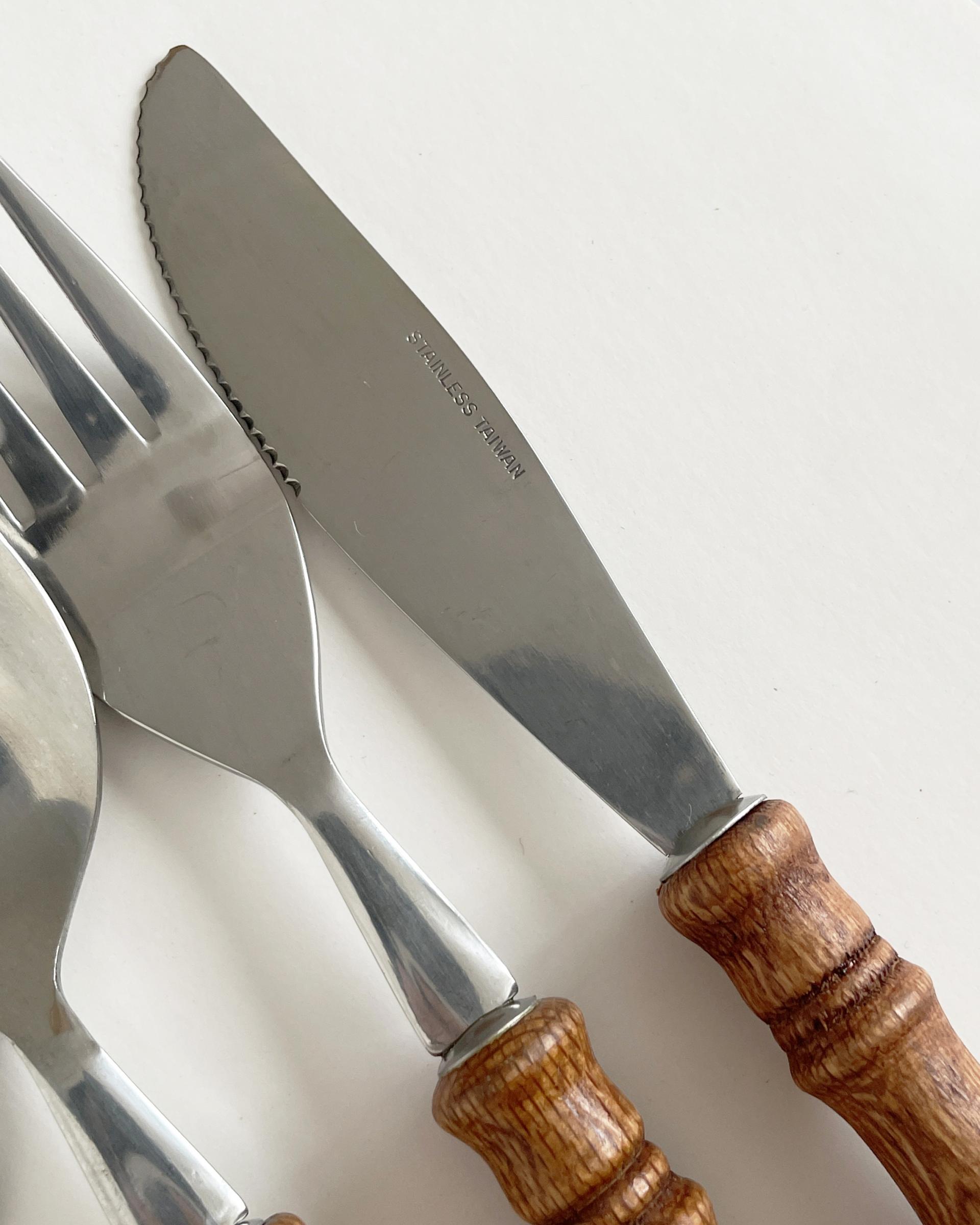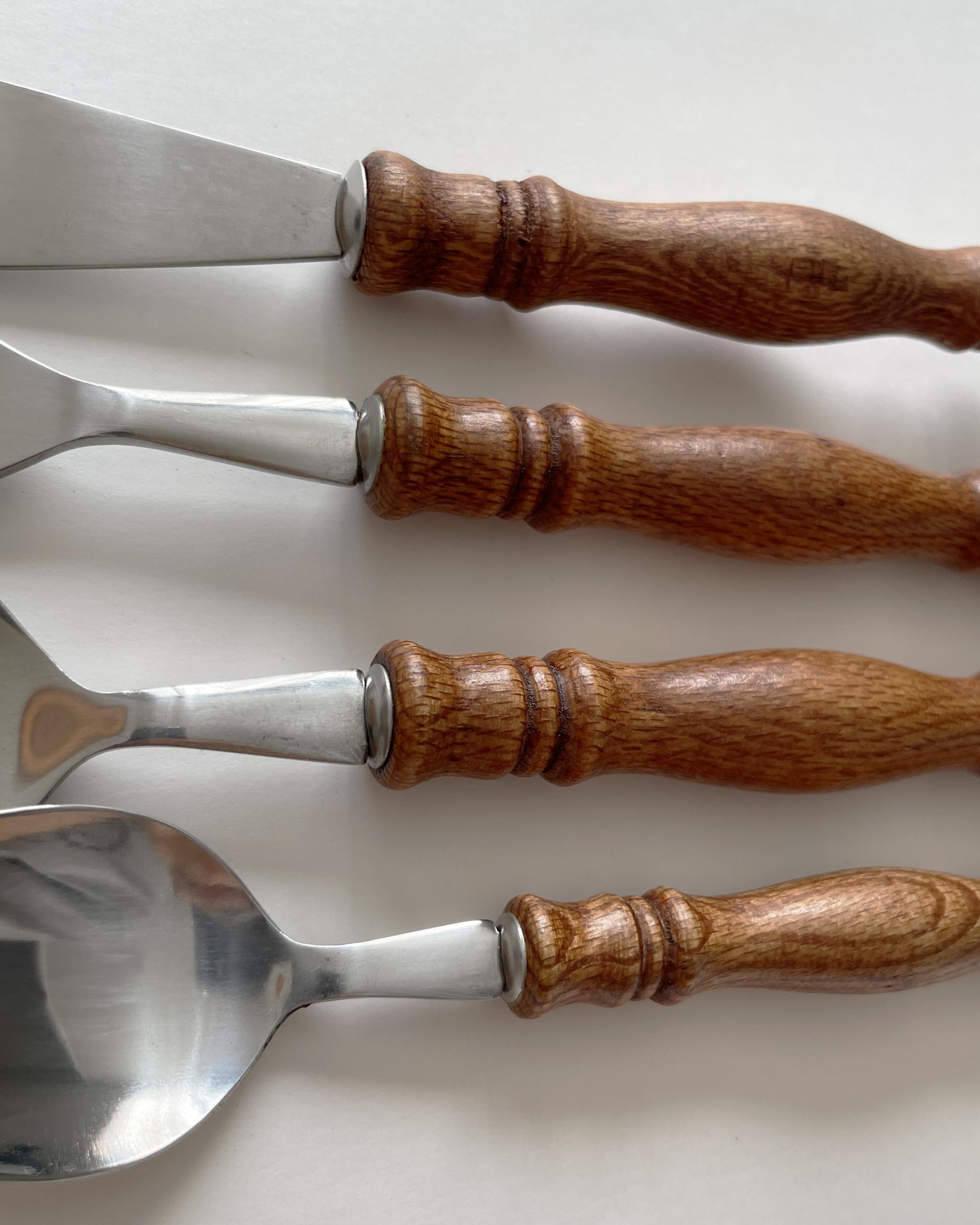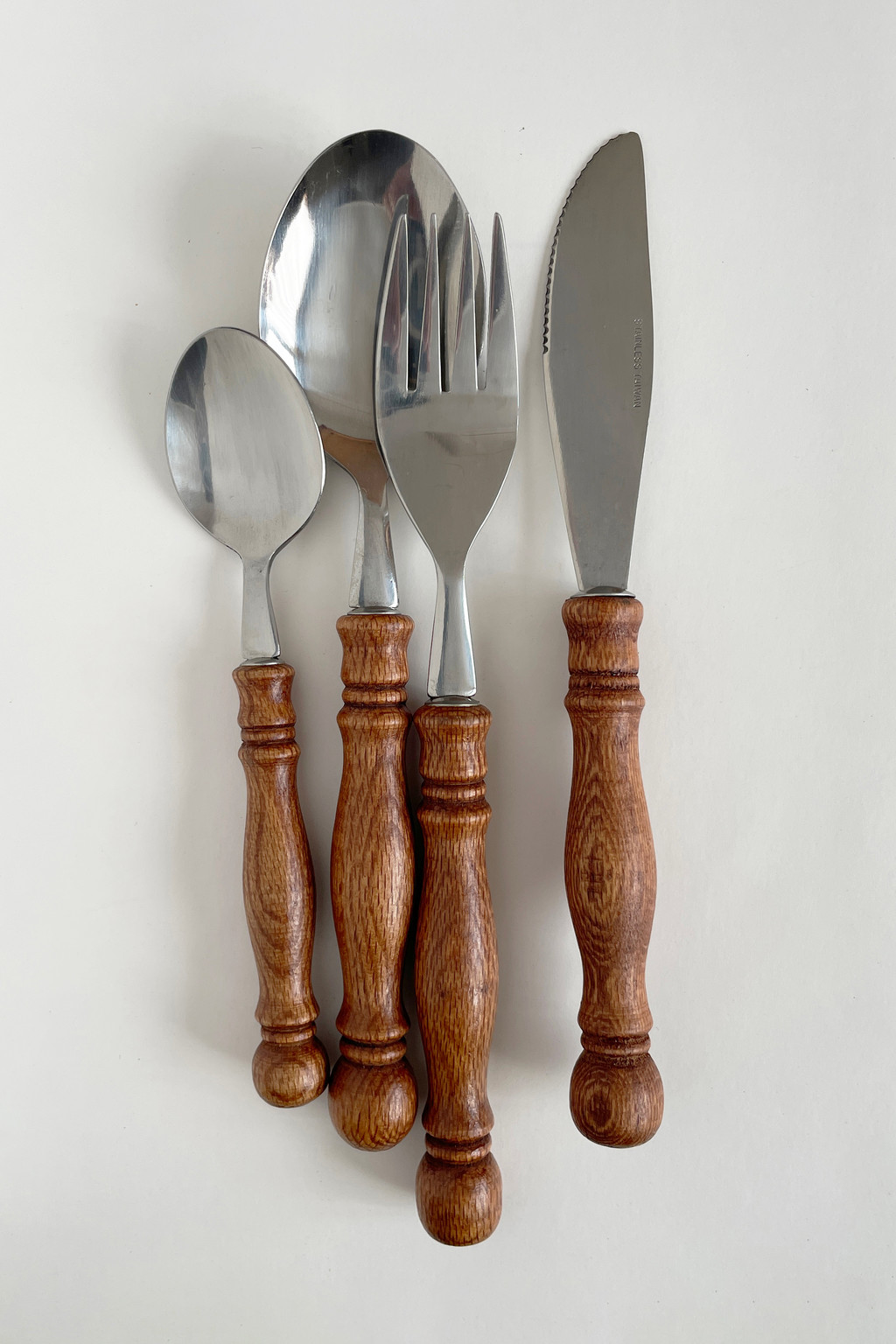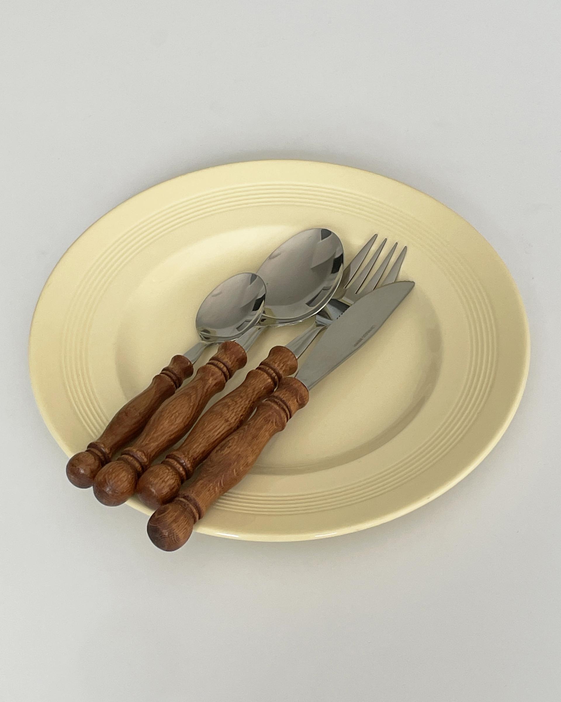 손에 잘 감기는 곡선형으로 디자인된 나무 손잡이의 아름다운 빈티지 커틀러리 세트입니다. 사용감이 없는 좋은 컨디션으로 입고되었습니다. 티 스푼 1개, 테이블 스푼 1개, 테이블 포크 1개, 테이블 나이프 1개가 1세트입니다.