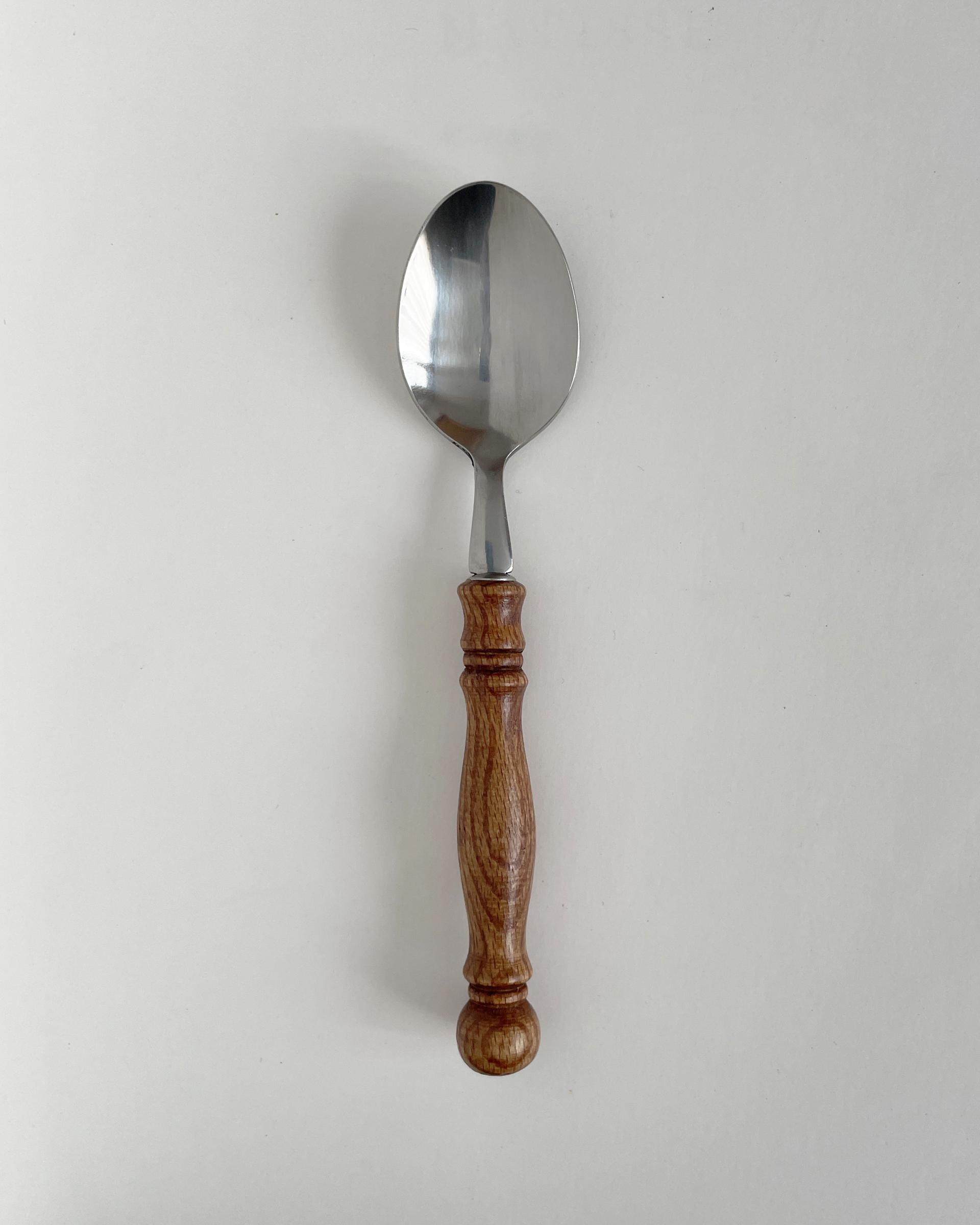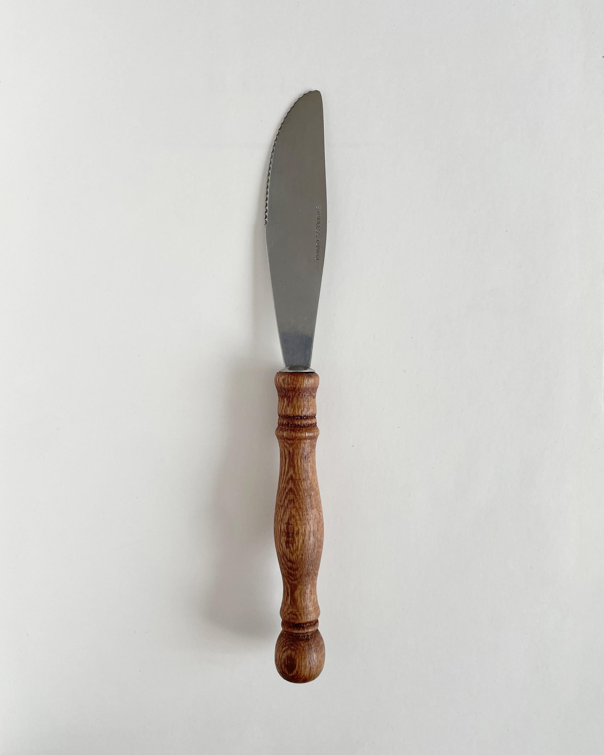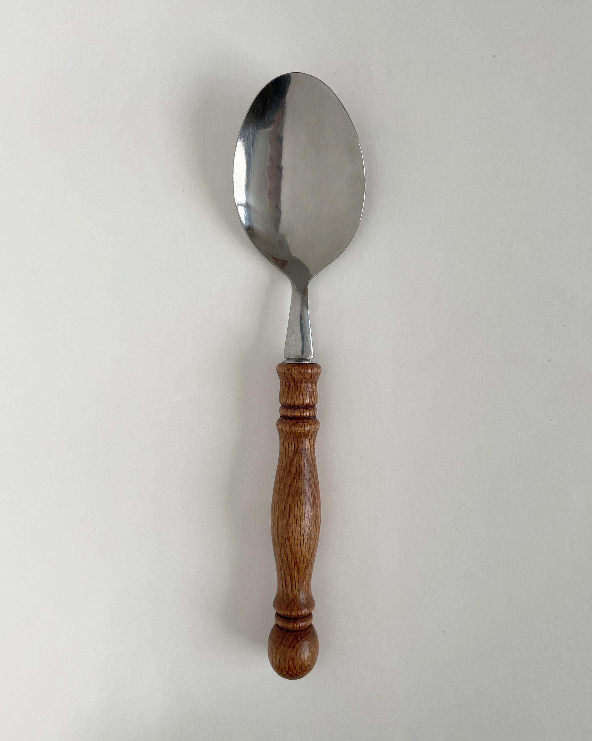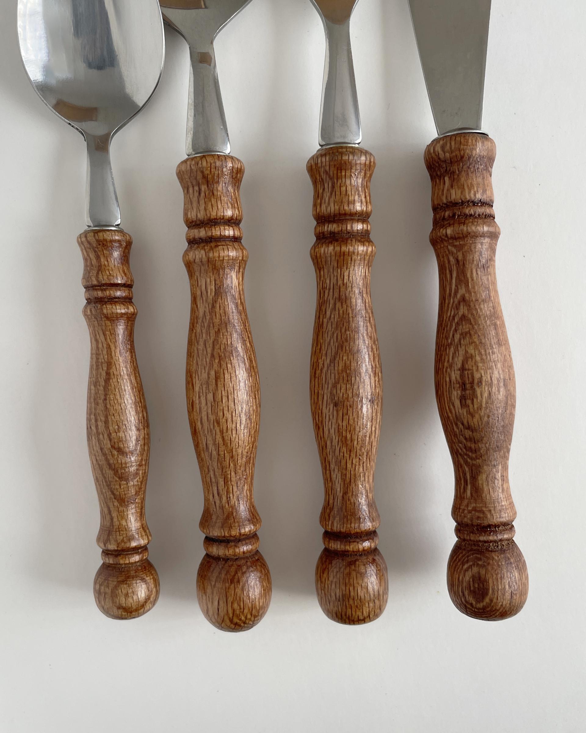 손에 잘 감기는 곡선형으로 디자인된 나무 손잡이의 아름다운 빈티지 커틀러리 세트입니다. 사용감이 없는 좋은 컨디션으로 입고되었습니다. 티 스푼 1개, 테이블 스푼 1개, 테이블 포크 1개, 테이블 나이프 1개가 1세트입니다.