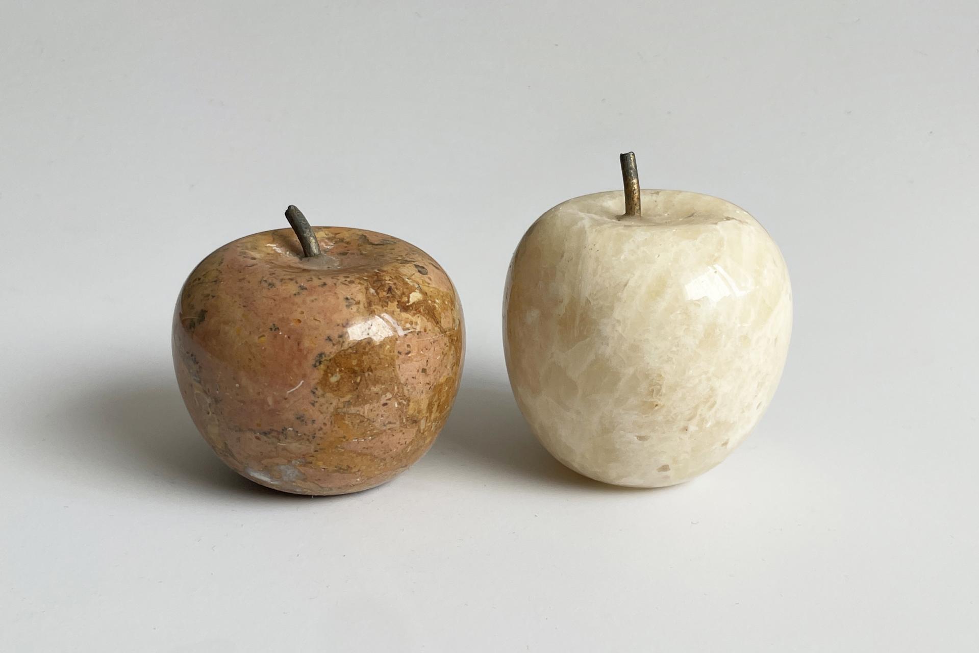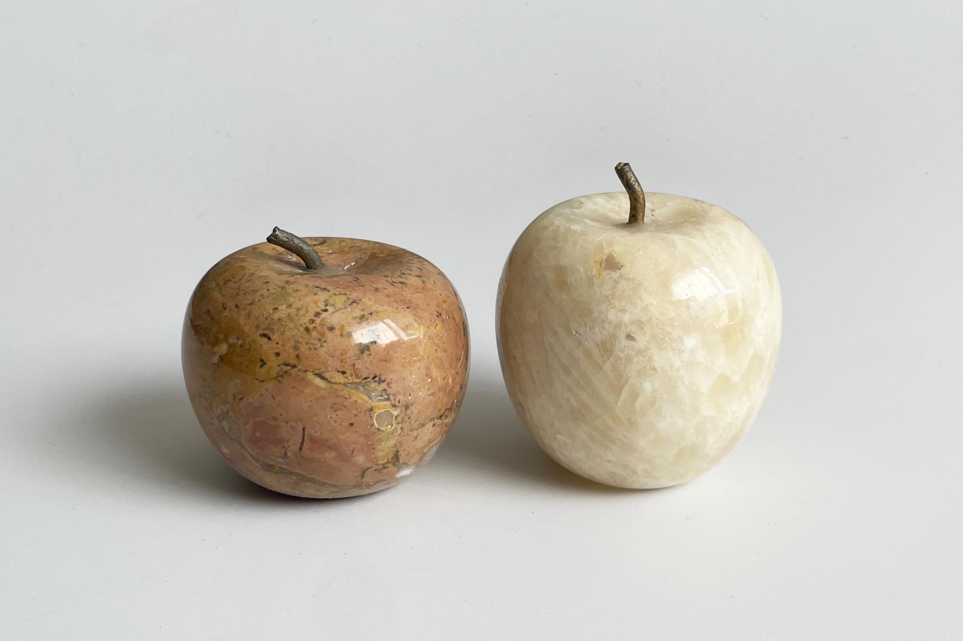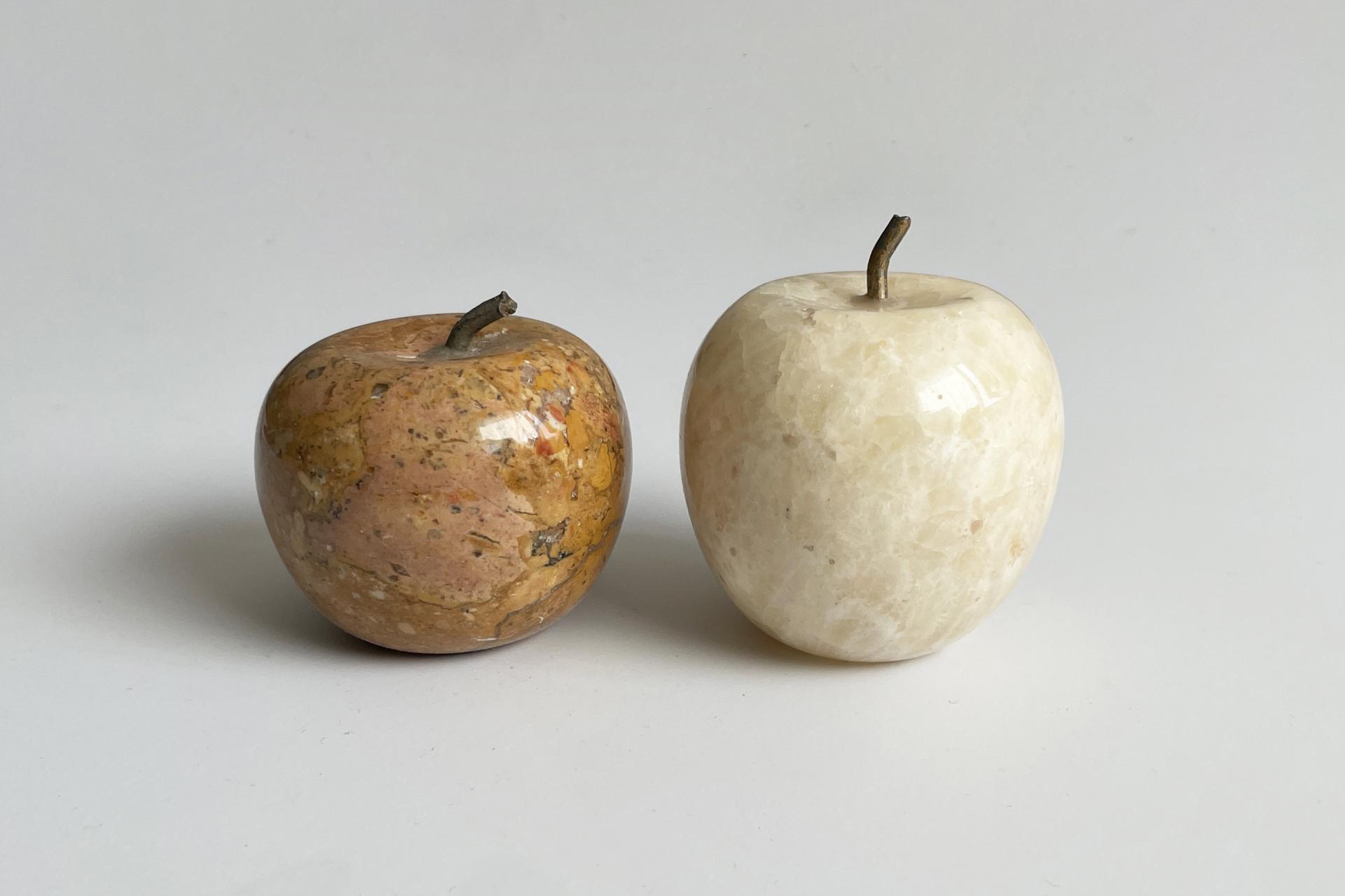 빈티지 사과 모양 문진입니다. 천연 대리석 재질로 만들어졌으며, 재질 특유의 자연스러운 광택과 무늬가 매력적입니다. 너비와 높이가 40-50mm 정도의 크기이며, 문진으로도 공간을 장식하는 오브제로도 활용하기 좋습니다. 사진 속 문진 2개가 1 세트입니다.