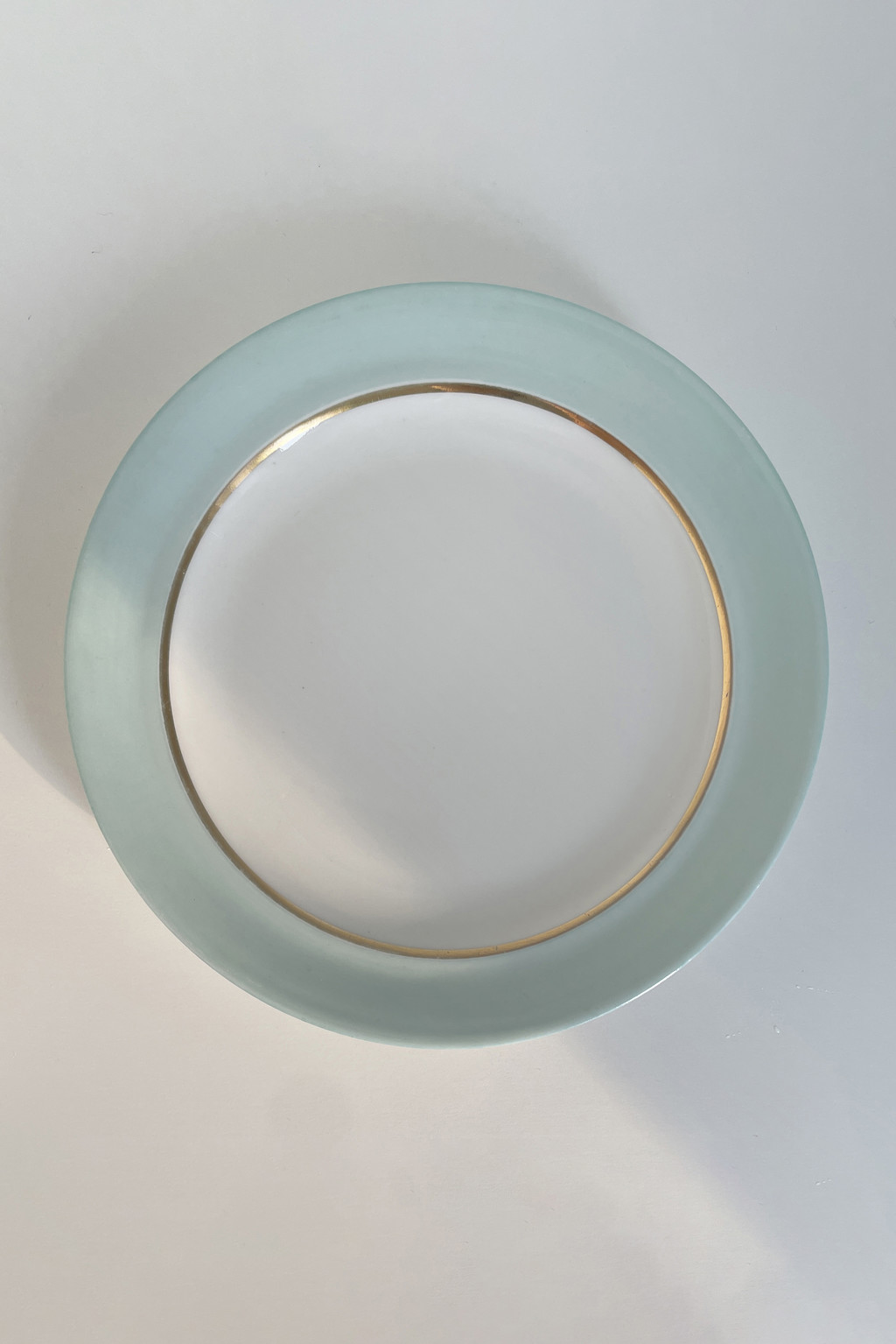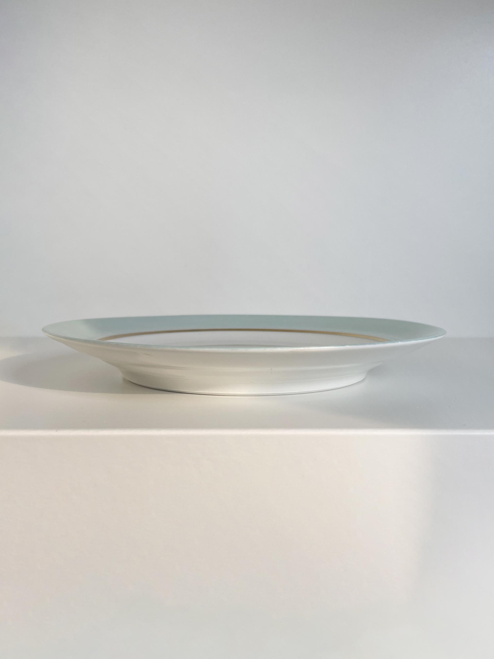 프랑스 Limoges 사의 빈티지 사이드 접시입니다. 은은한 파스텔톤의 민트빛과 금색 테두리의 조화가 매력적입니다.