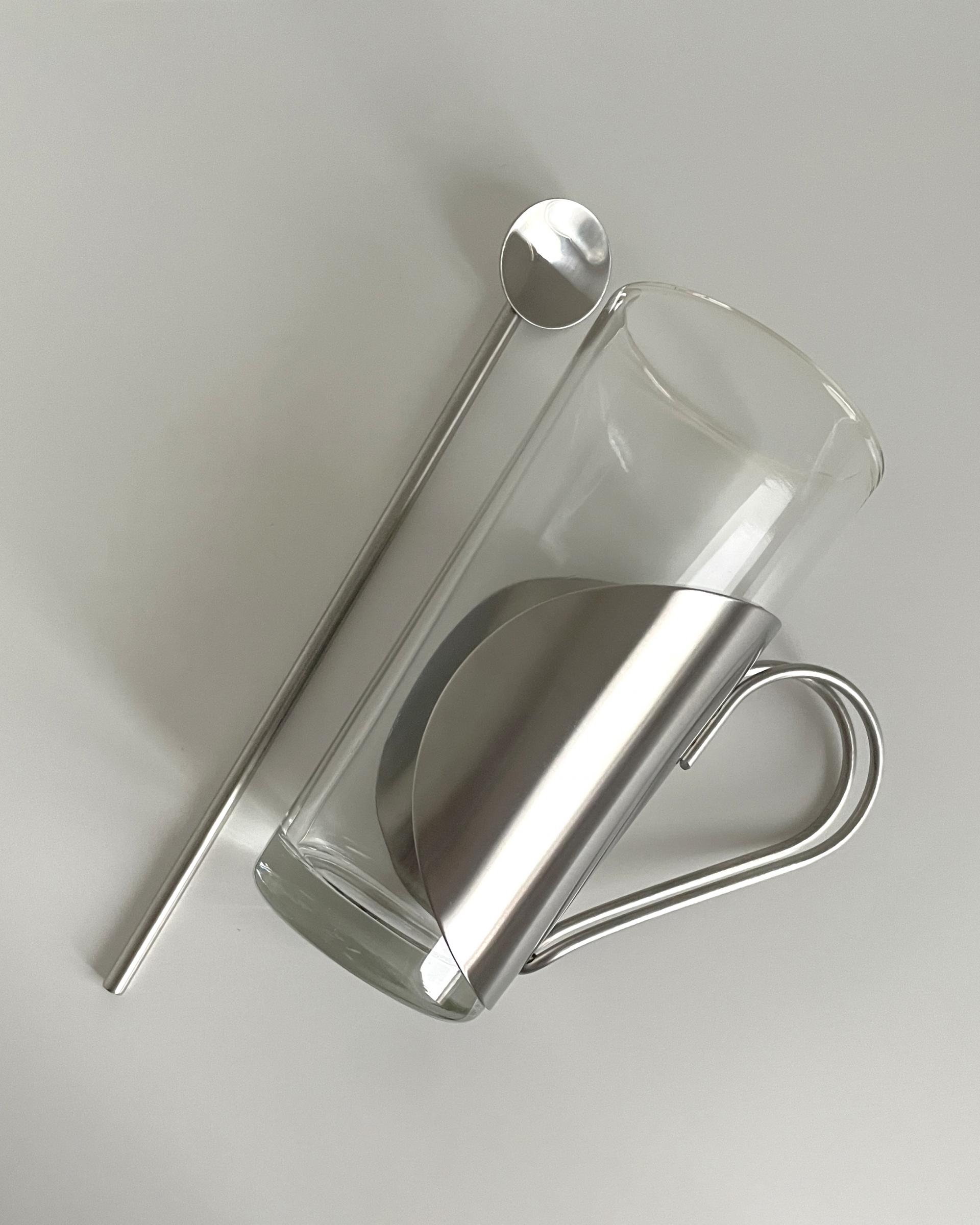 투명한 컵을 감싸고 있는 둥근 메탈 홀더의 쉐입이 매력적인 빈티지 컵입니다. 스테인리스 스틸 재질의 홀더는 컵과 분리가 가능하여 세척과 보관이 용이합니다. 사진 속 머들러와 함께 세트입니다.