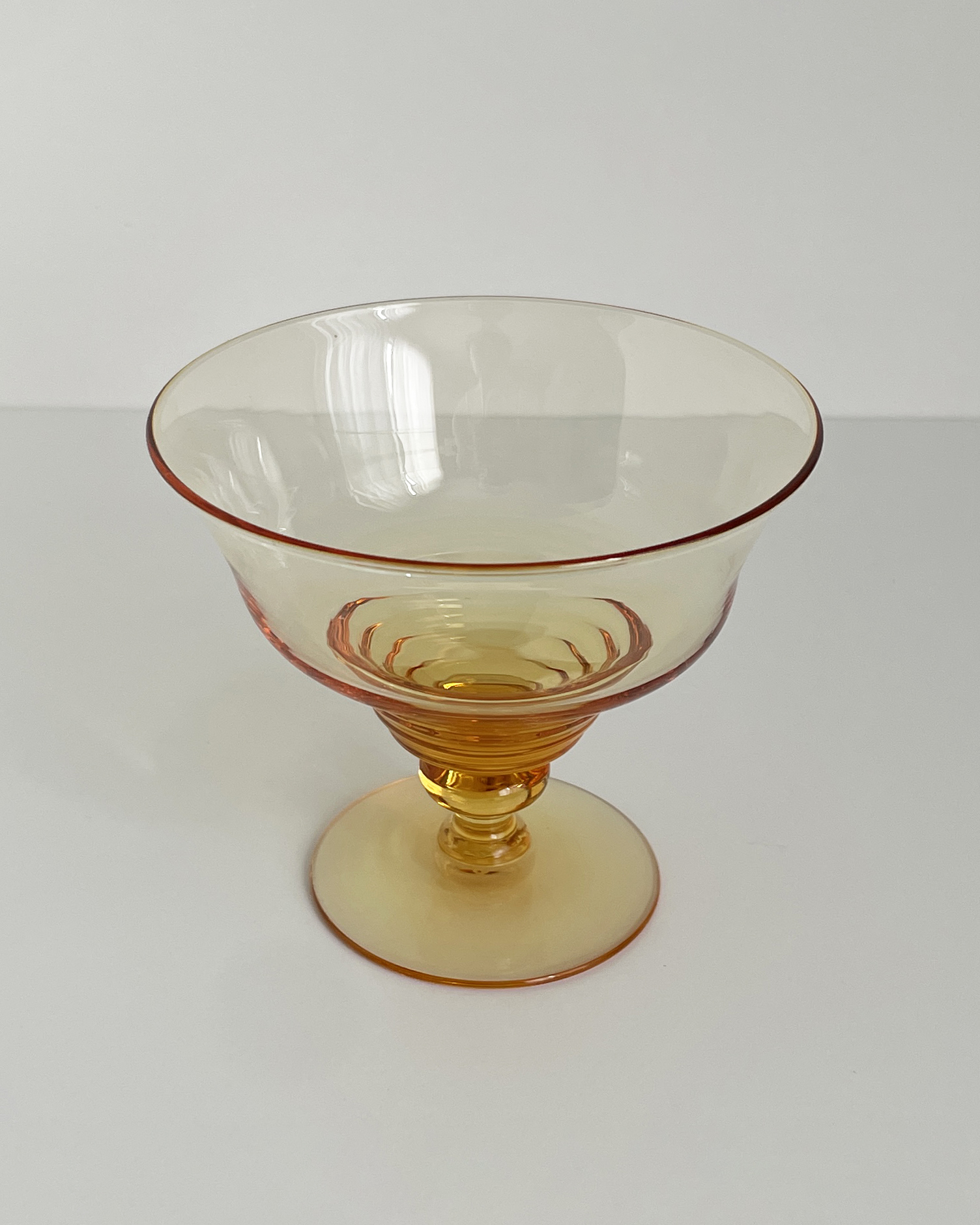 영국 Stuart Crystal 사의 빈티지 크리스탈 샴페인 쿠페입니다. 전체적으로 앰버컬러의 따뜻한 색감을 가지고 있으며 층층이 겹쳐지는 입체감있는 손잡이가 매력적입니다.
