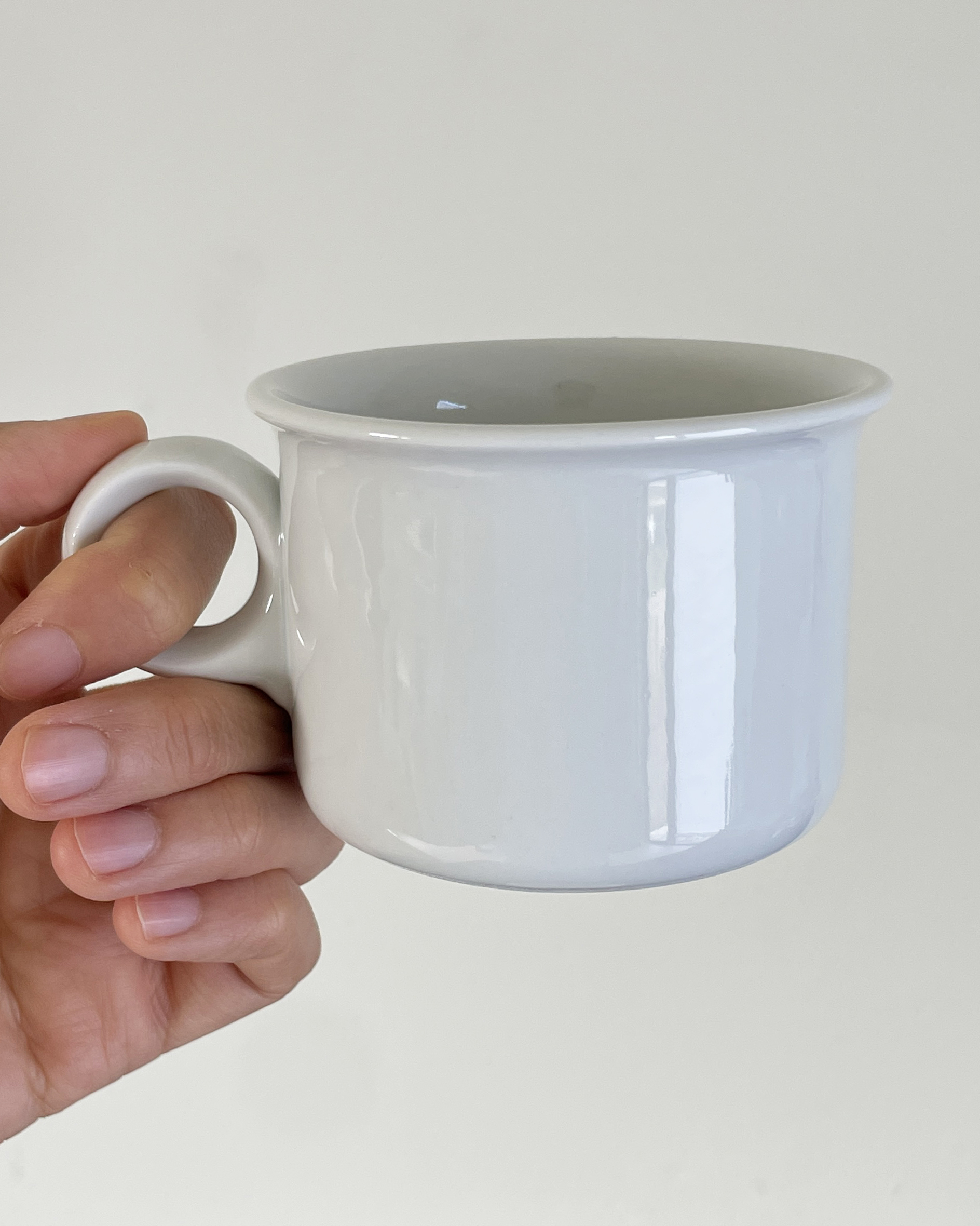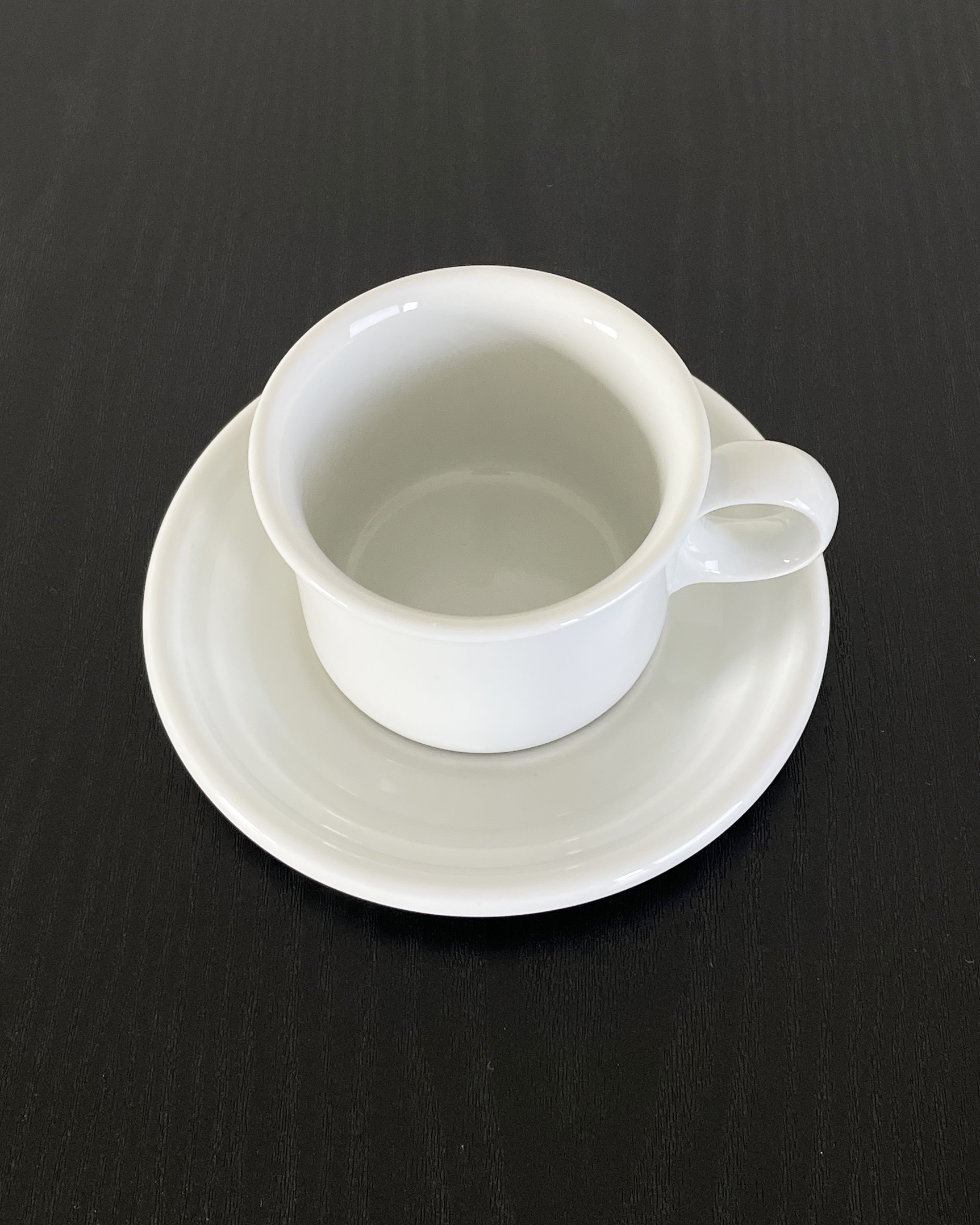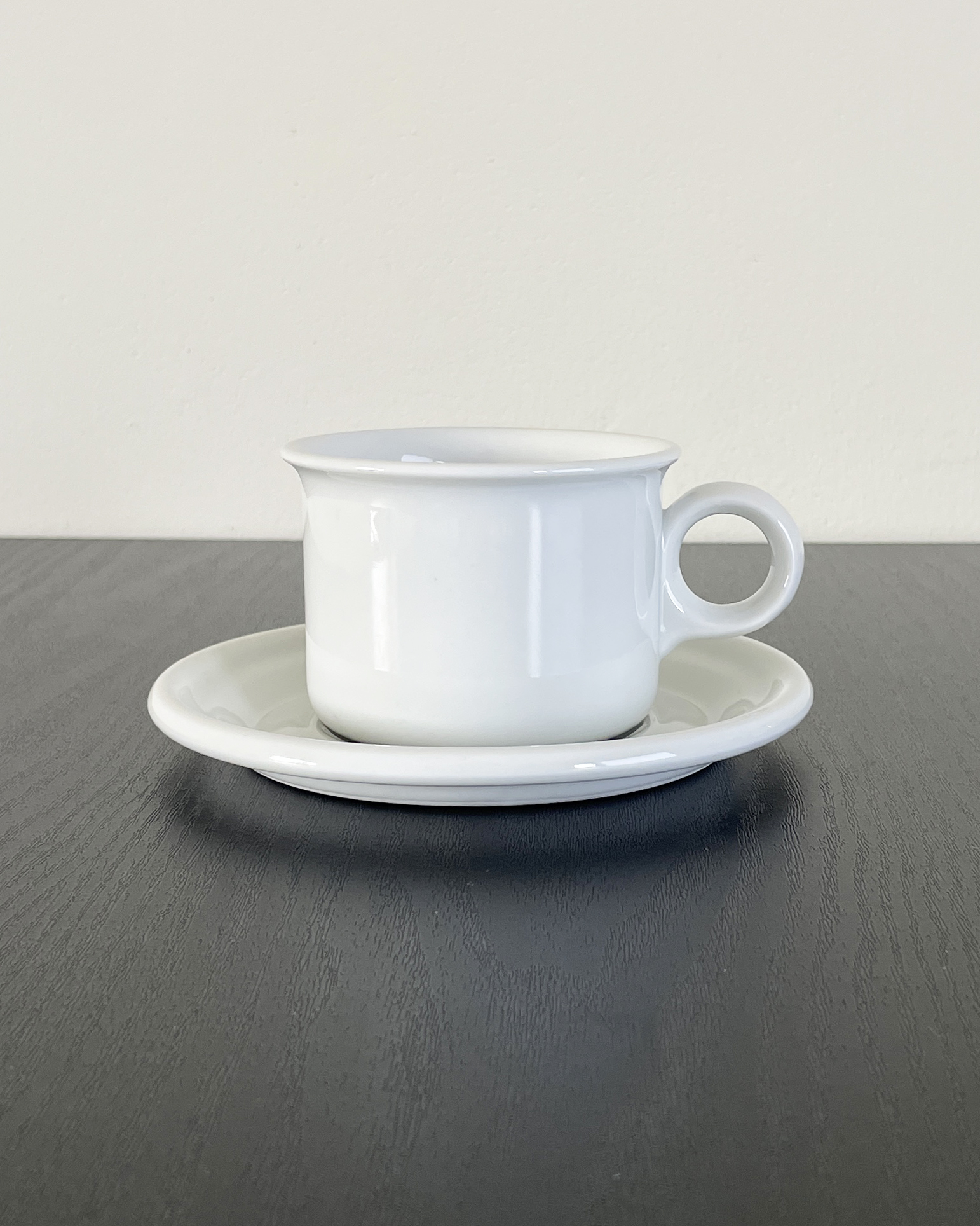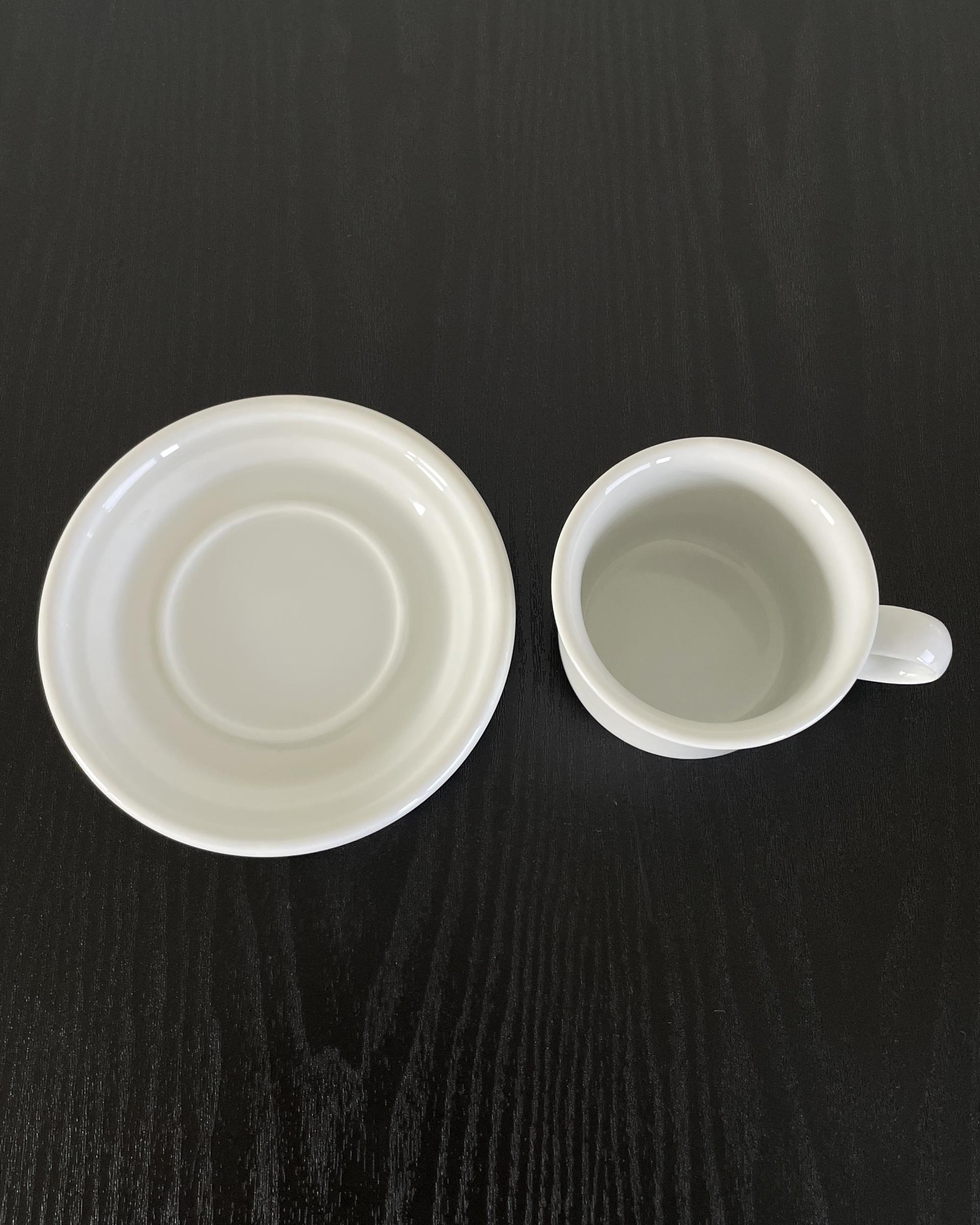 덴마크 Dansk 사의 Eslau 시리즈 빈티지 컵과 소서입니다. 깨끗한 백색바탕에, 입술이 닿는 가장자리의 형태와 동그란 손잡이가 매력적입니다.